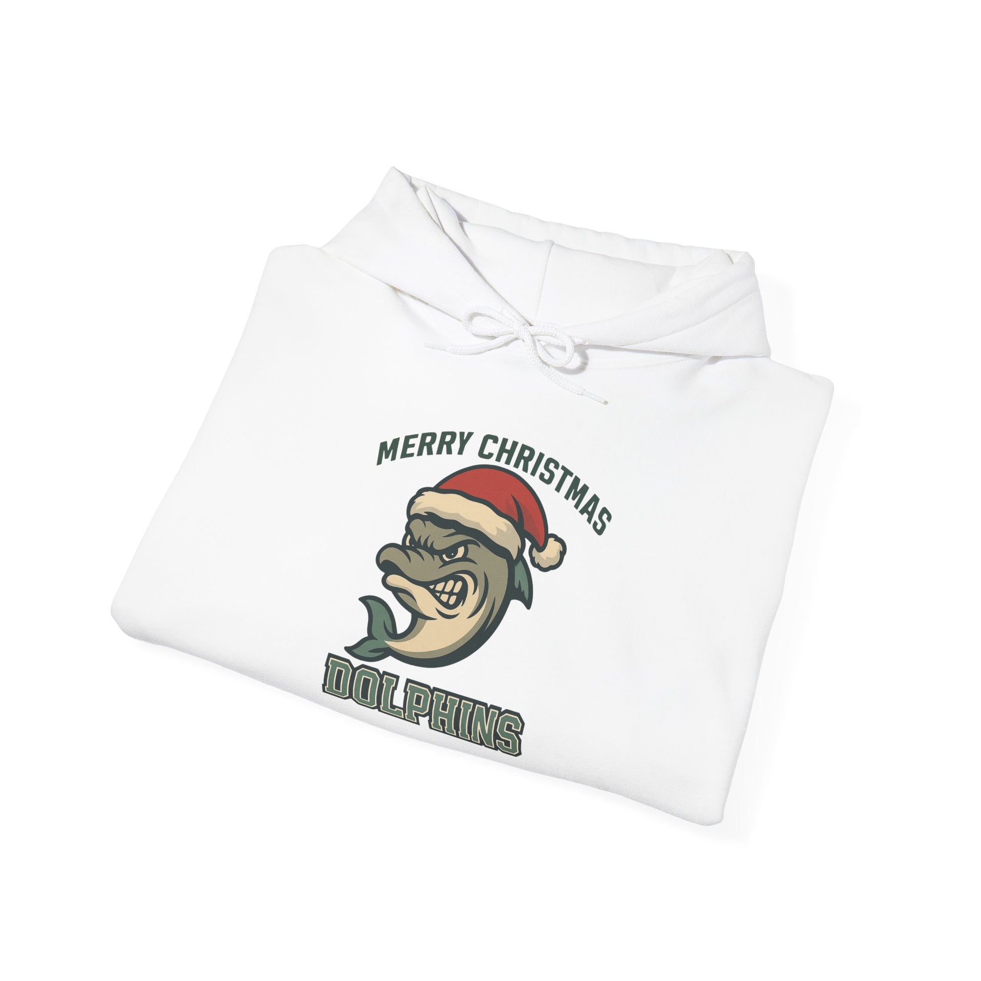 A soft, cozy white hoodie that carries a playful, vintage-sport vibe with a holiday twist. The front shows a retro-style dolphin mascot wearing a Santa hat, framed by a small “Merry Christmas” arc above and the team name below. It feels like a worn-in team sweatshirt you’d grab on chilly nights by the boardwalk or layered over a tee for a late-night bonfire. Lightweight but warm, the pouch pocket and double-lined hood make it easy to tuck cold hands and keep heat close. The design sits modestly on the chest so the hoodie reads casual and familiar — the kind you reach for when you want comfort with personality during winter gatherings or relaxed game nights.